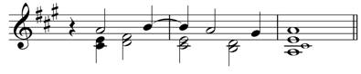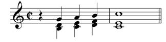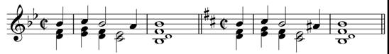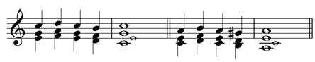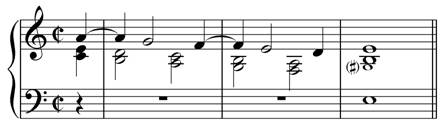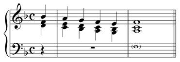 Auch aufwärts ist eine Konsekution der Außenstimmen möglich. Hier jedoch ergibt sich kaum die Möglichkeit einer korrekten Dissonanz-Konsonanz-Kette. Interessanterweise wirken die Quinten auf der 1. und 3. Zählzeit dennoch wie eine Art Vorhalt. Das Zusammenwirken von Rhythmik, Metrik und melodischer Bewegung erzeugt eine Auffassungsdissonanz.