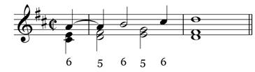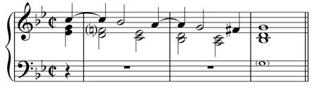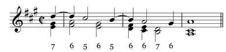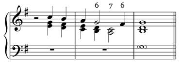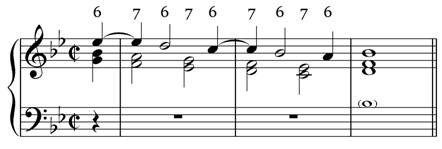 Anstatt abwärtsführender 7-6-Konsekutiven gibt es auch den (selteneren) Fall von 6-5-Konsekutiven. Spätestens in der Klausel jedoch müssen wir zum 7-6-Vorhalt zurückkehren, was ein ziemlich kompliziertes Verhältnis der zwei rhythmischen Bewegungen verursacht:
